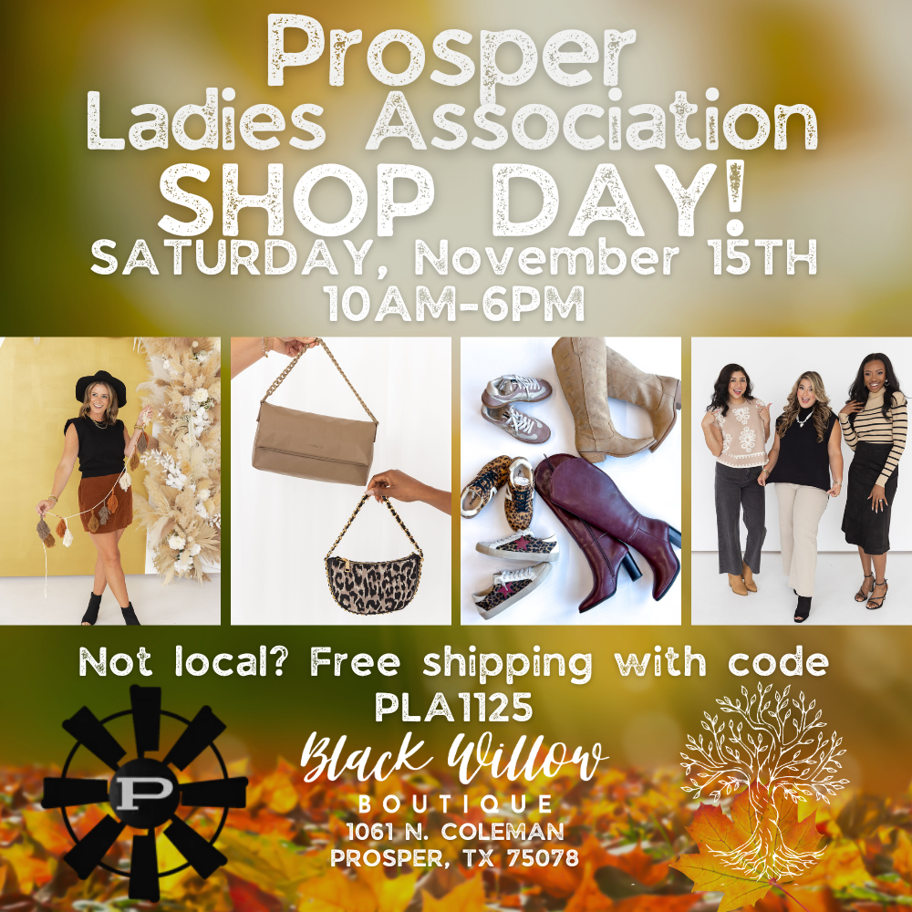 Join us Saturday, November 15th from 10AM-6PM for a special Prosper Ladies Association Shop Day at Black Willow Boutique!
