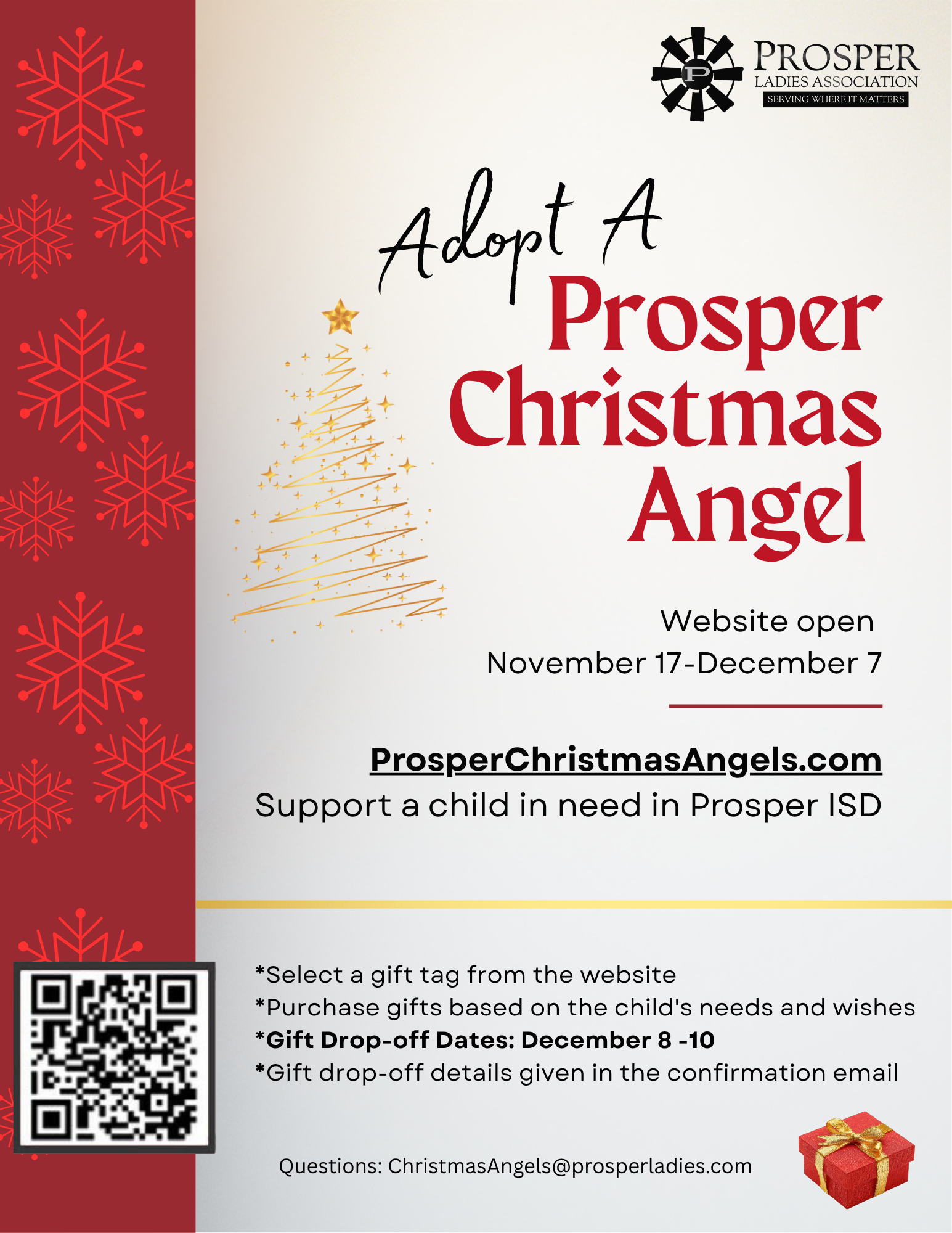 Join us in spreading holiday joy by adopting a Prosper Christmas Angel! Starting November 17, you can find angel tags on Christmas trees around town or visit ProsperChristmasAngels.com to select a child in need from Prosper ISD.